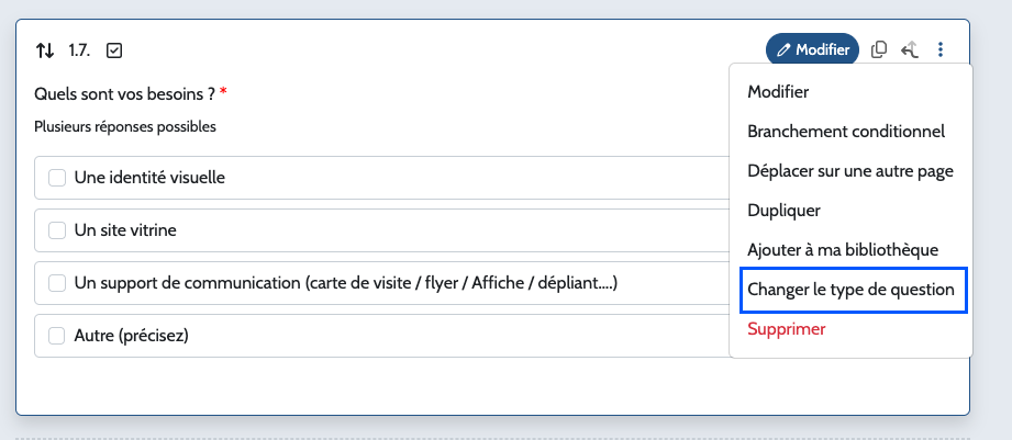 3. Sélectionnez l’option « Changer le type de question » dans le menu déroulant.