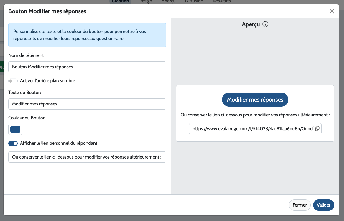 Vous pouvez aussi permettre à vos répondants de revenir modifier leurs réponses ultérieurement, en leur transmettant leur lien personnel :